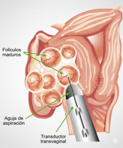 Tras la estimulación ovárica se realiza la aspiración folicular, un procedimiento ambulatorio y sin dolor bajo sedación que dura entre 10 y 30 minutos. Los óvulos se extraen con una aguja mediante aspiración de los folículos y la paciente reposa un par de horas. Si no produce óvulos, se puede recurrir a donación.Inseminación de ovocitos y cultivo de embriones